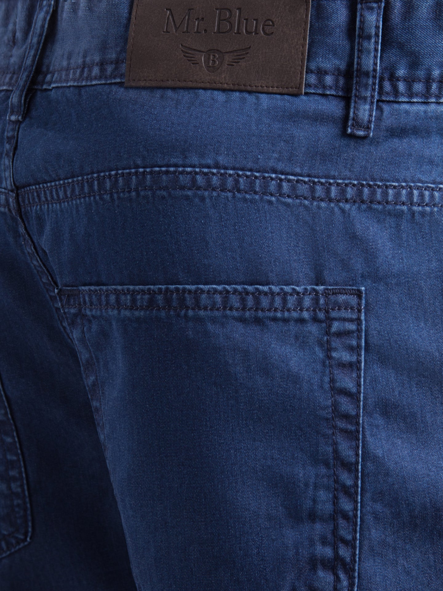 Calças de ganga cintura subida azul denim em tencel e algodão