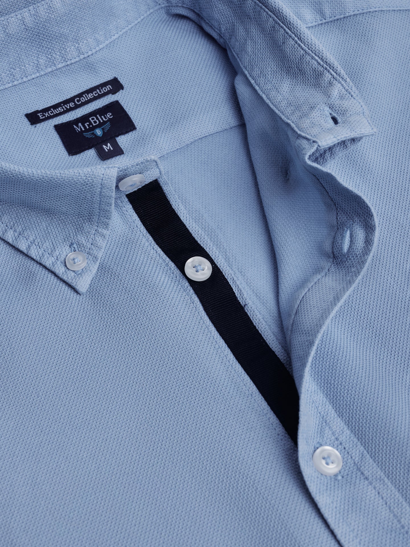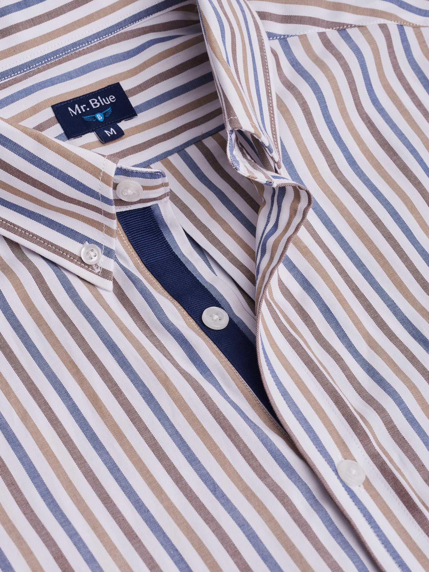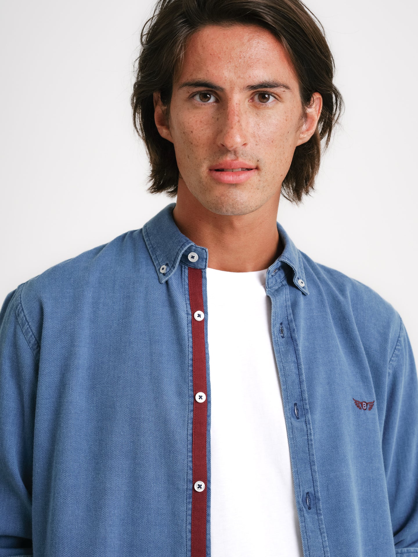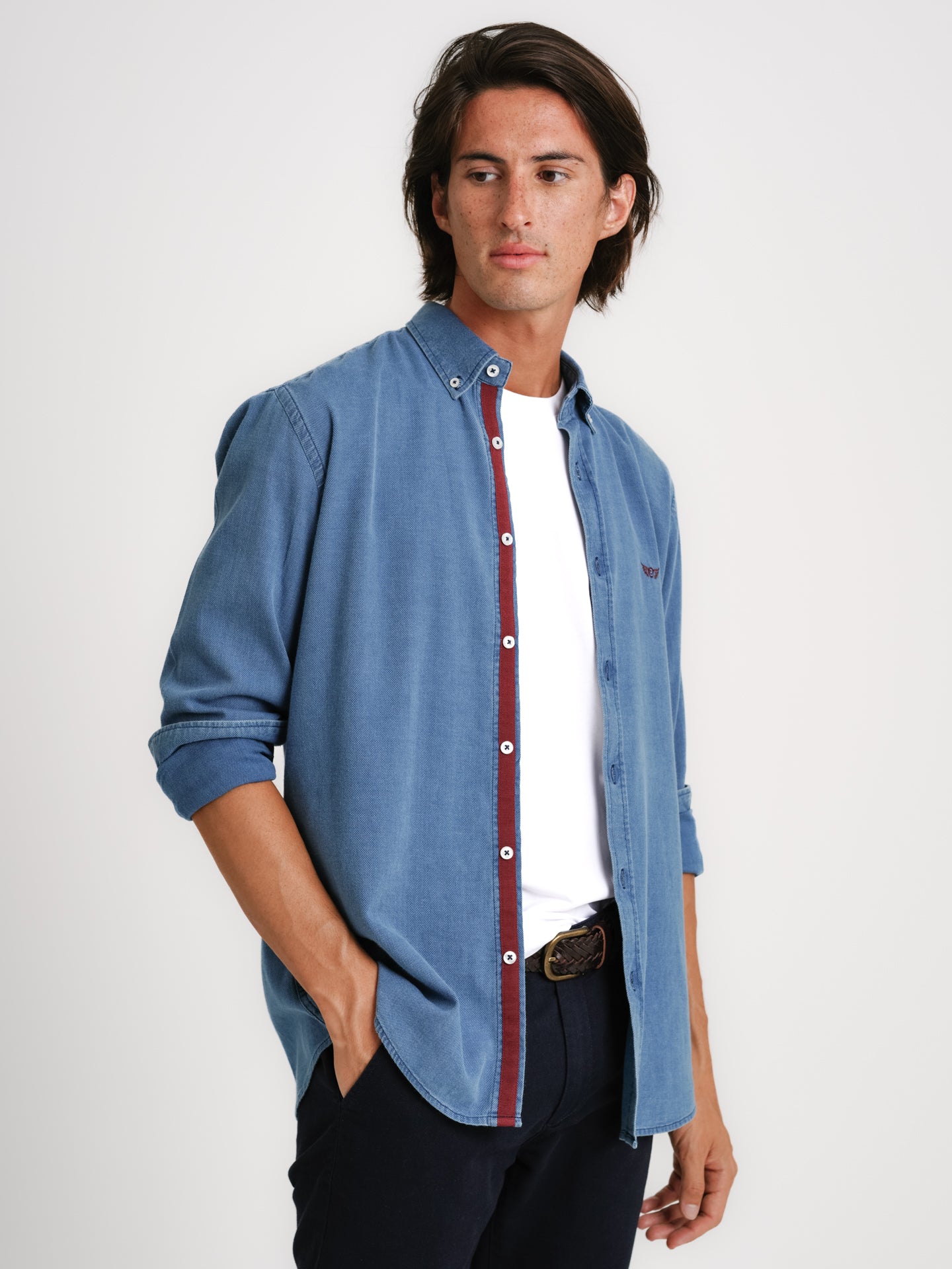 Camisa algodão às riscas azul claro e amarelo com bolso