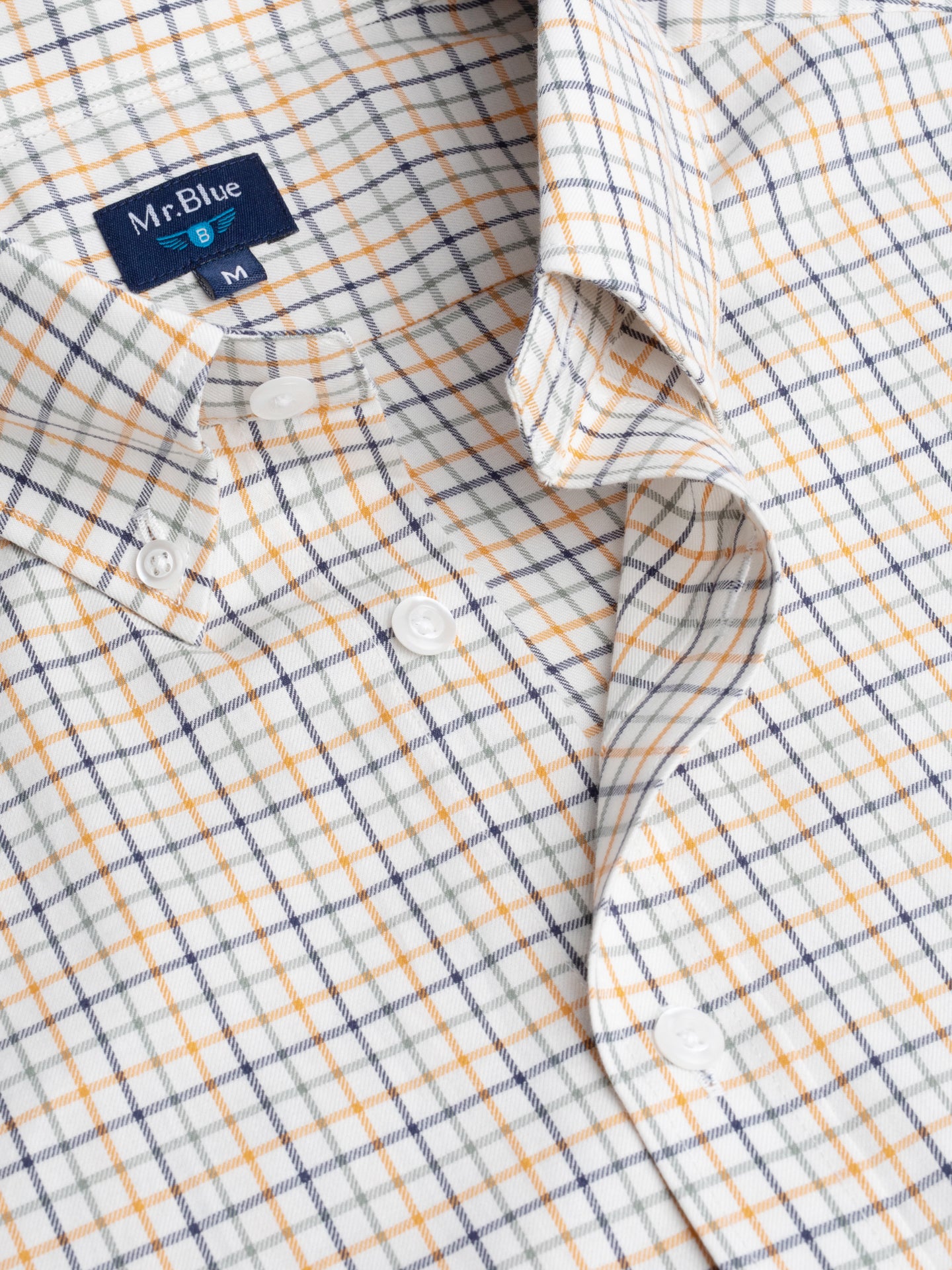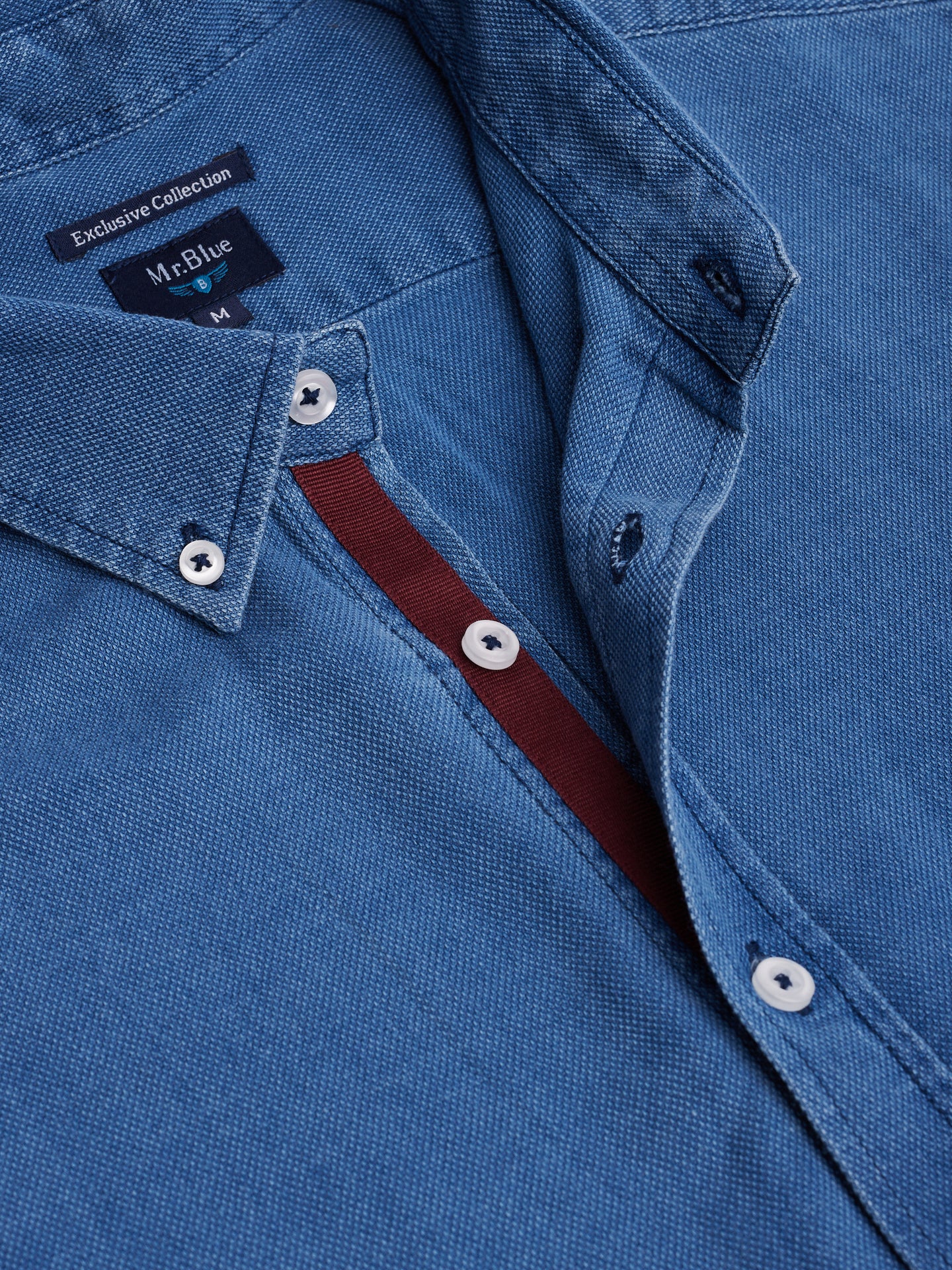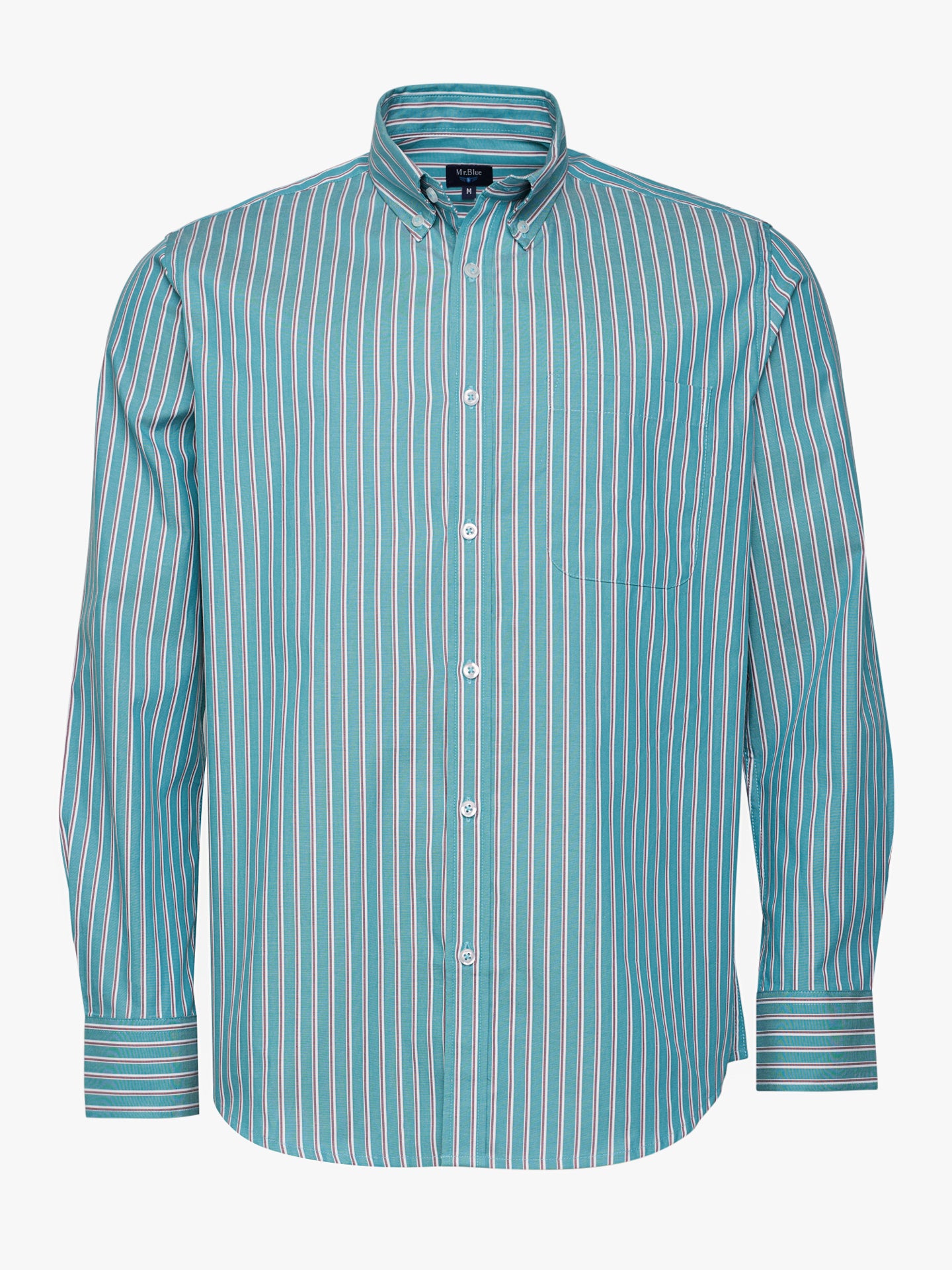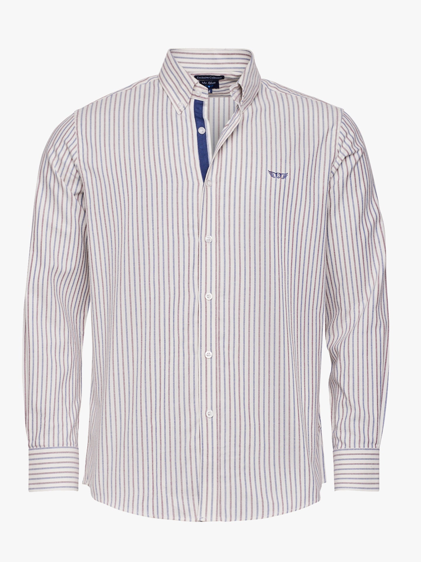 Camisa algodão às riscas azul claro e amarelo com bolso