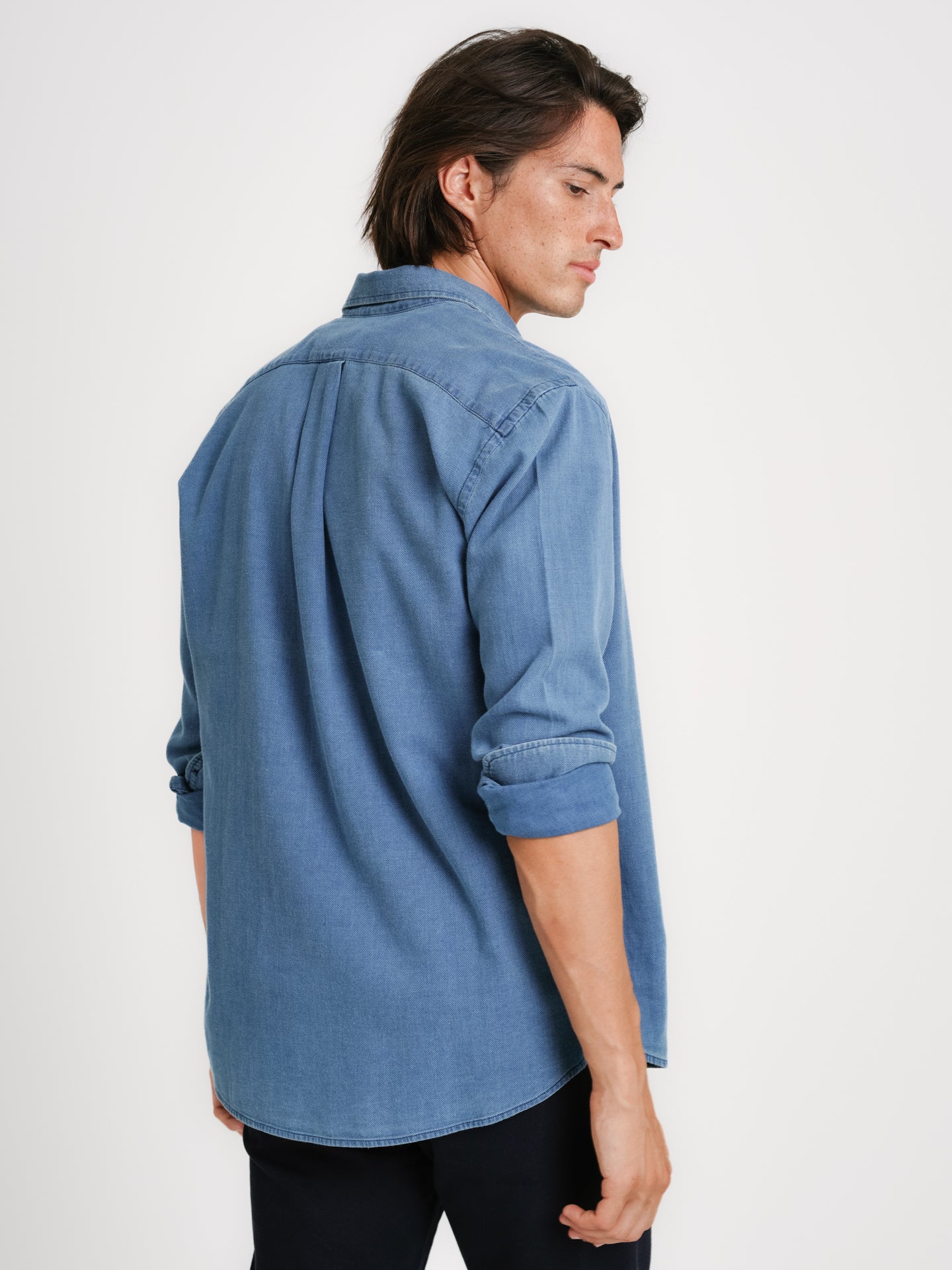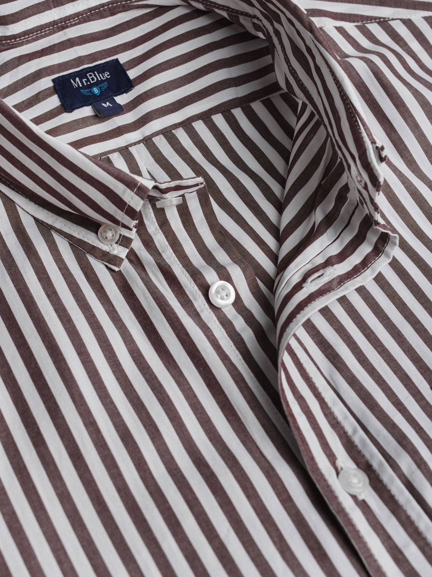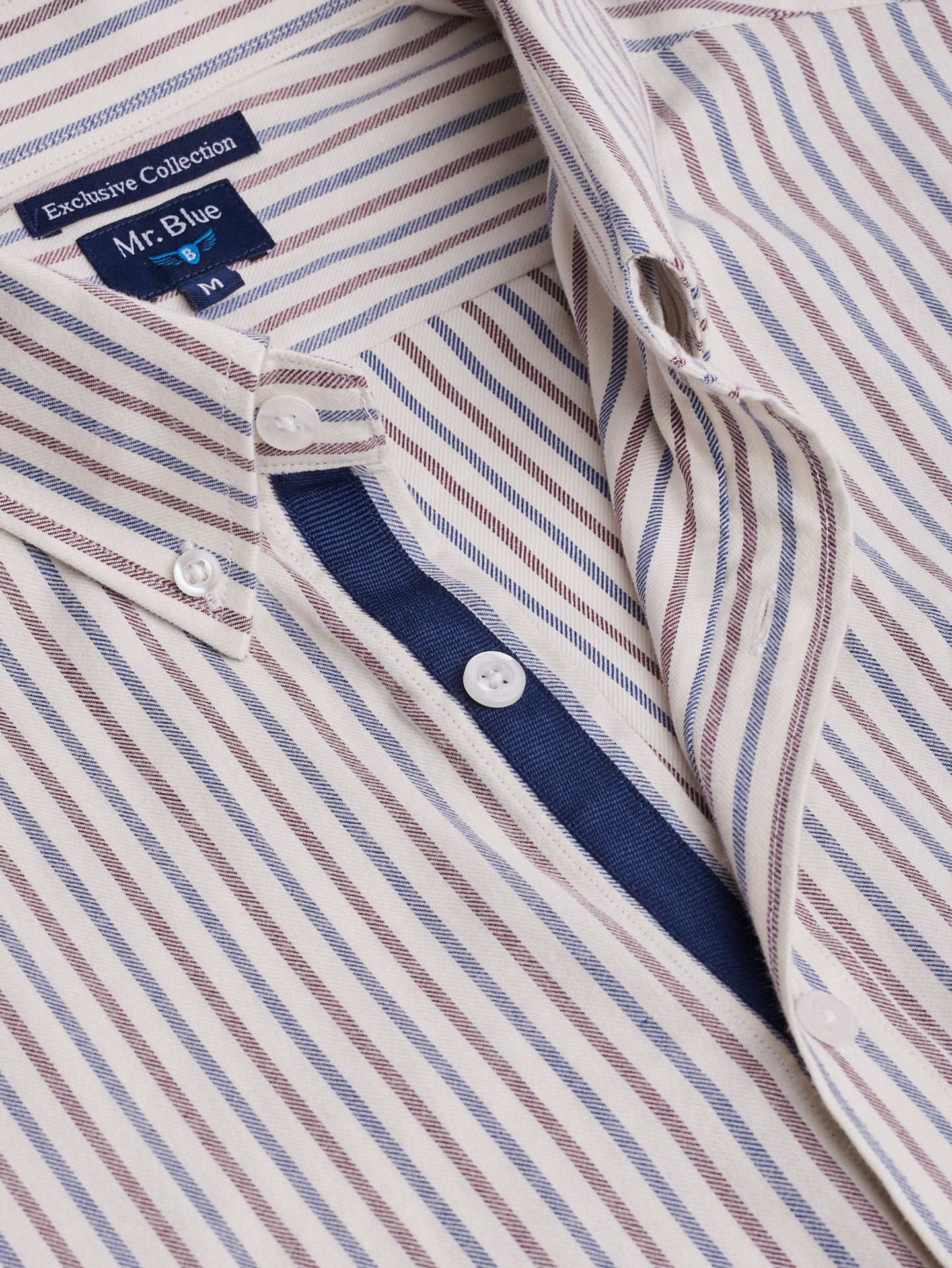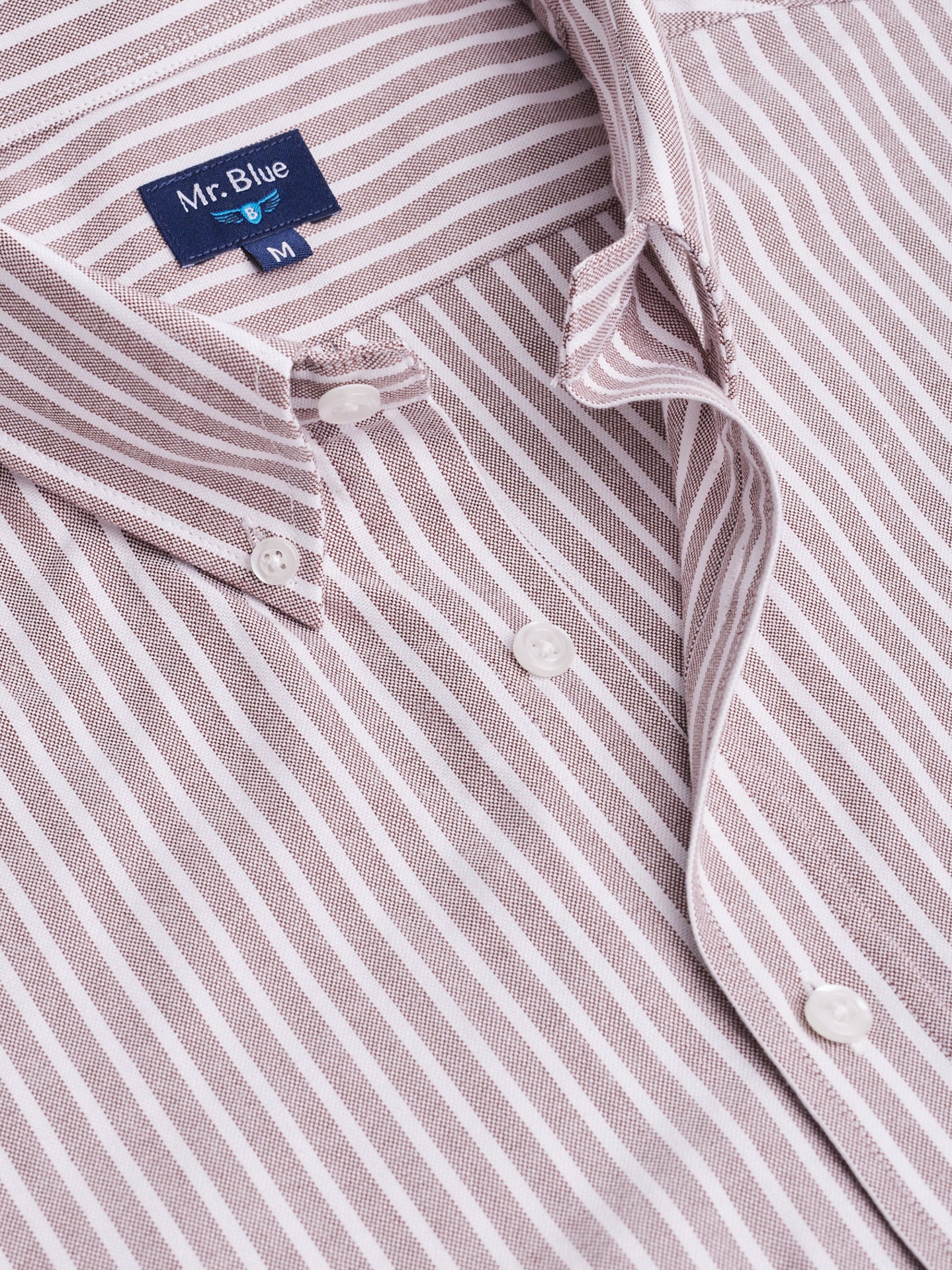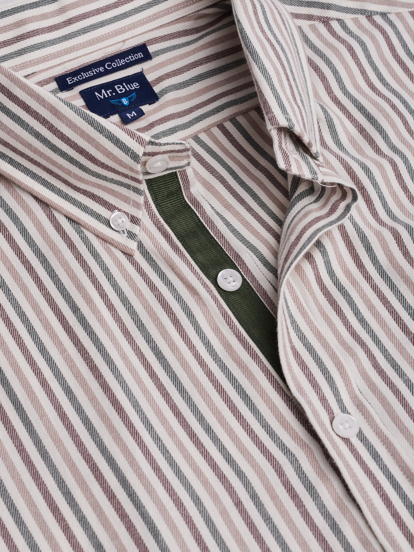 Camisa algodão às riscas azul claro e amarelo com bolso
