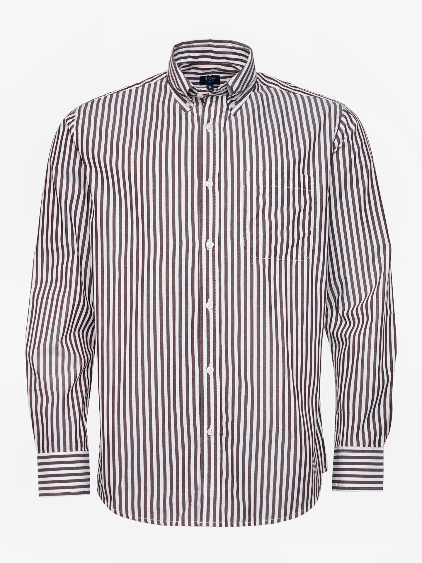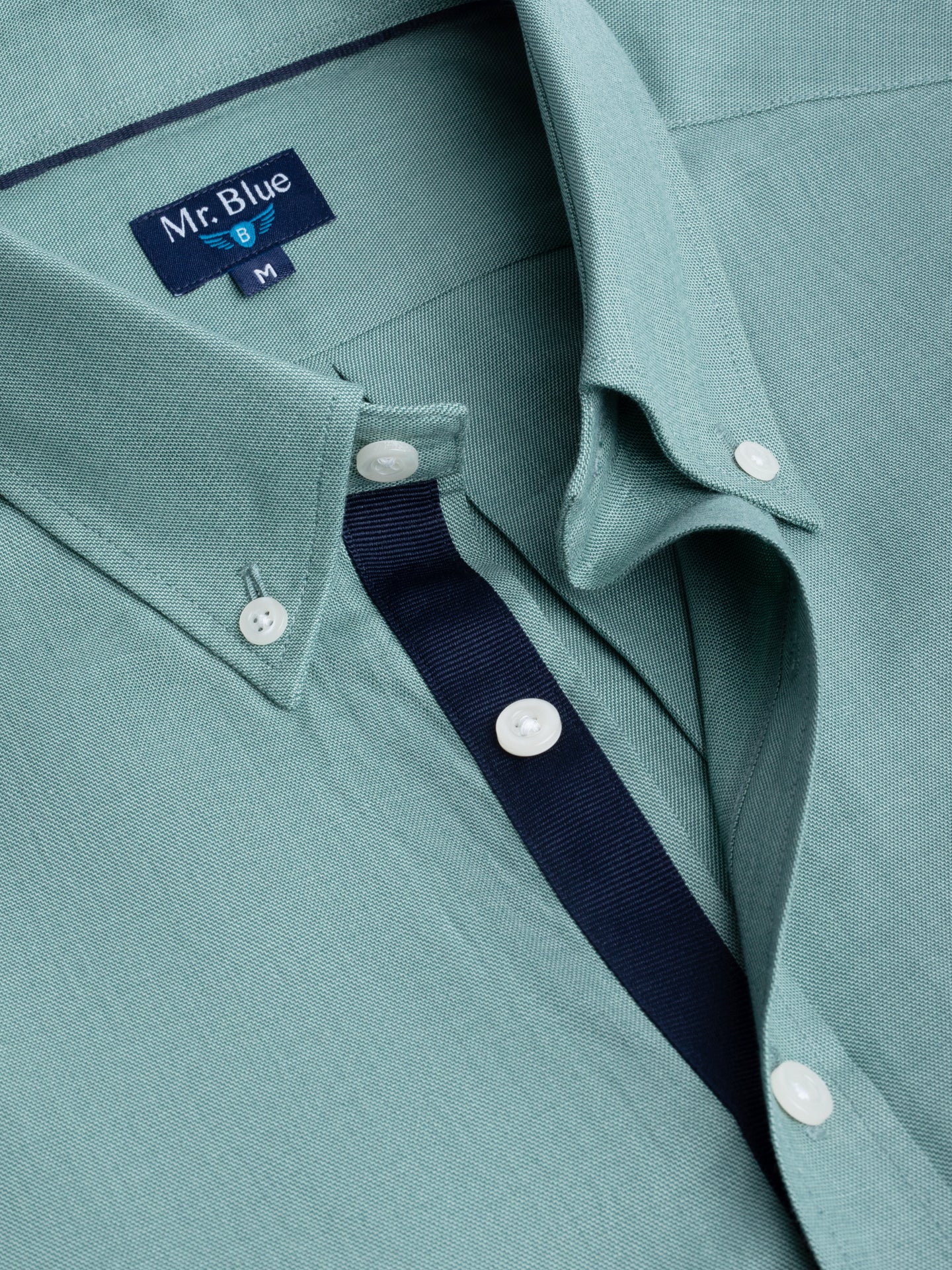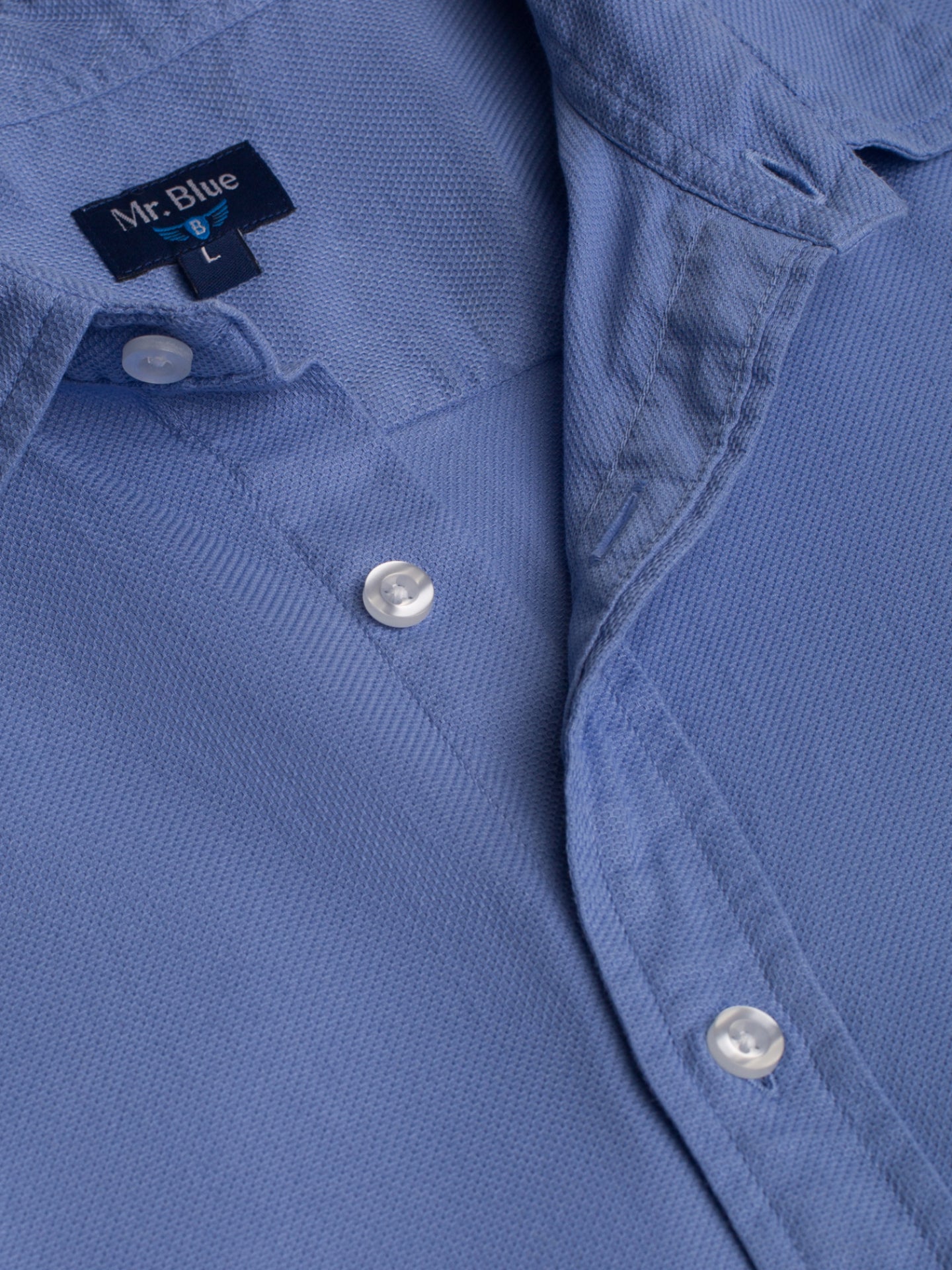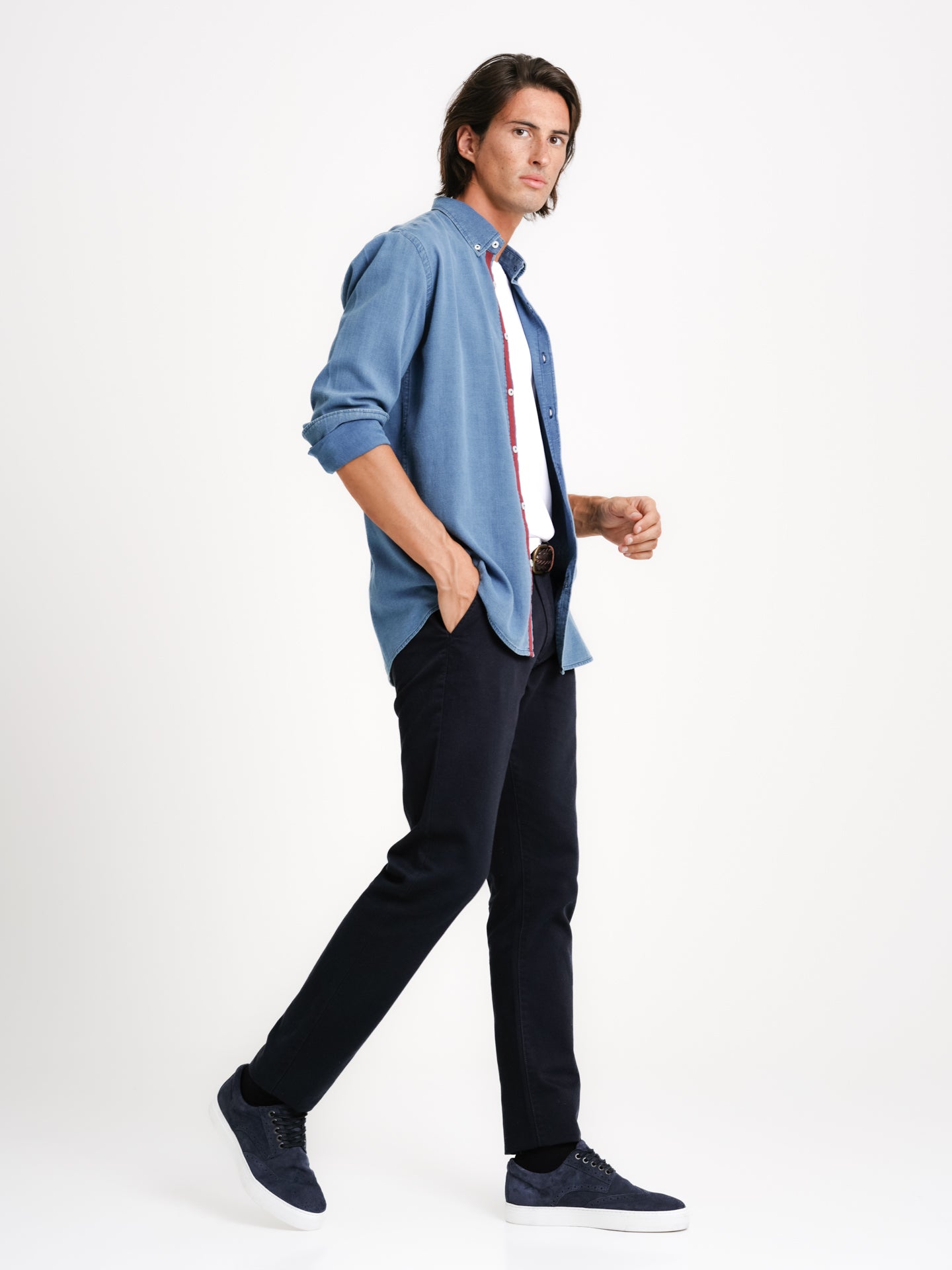Camisa algodão às riscas azul claro e amarelo com bolso