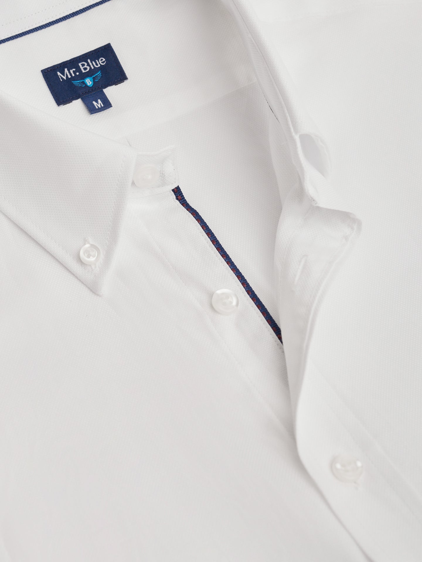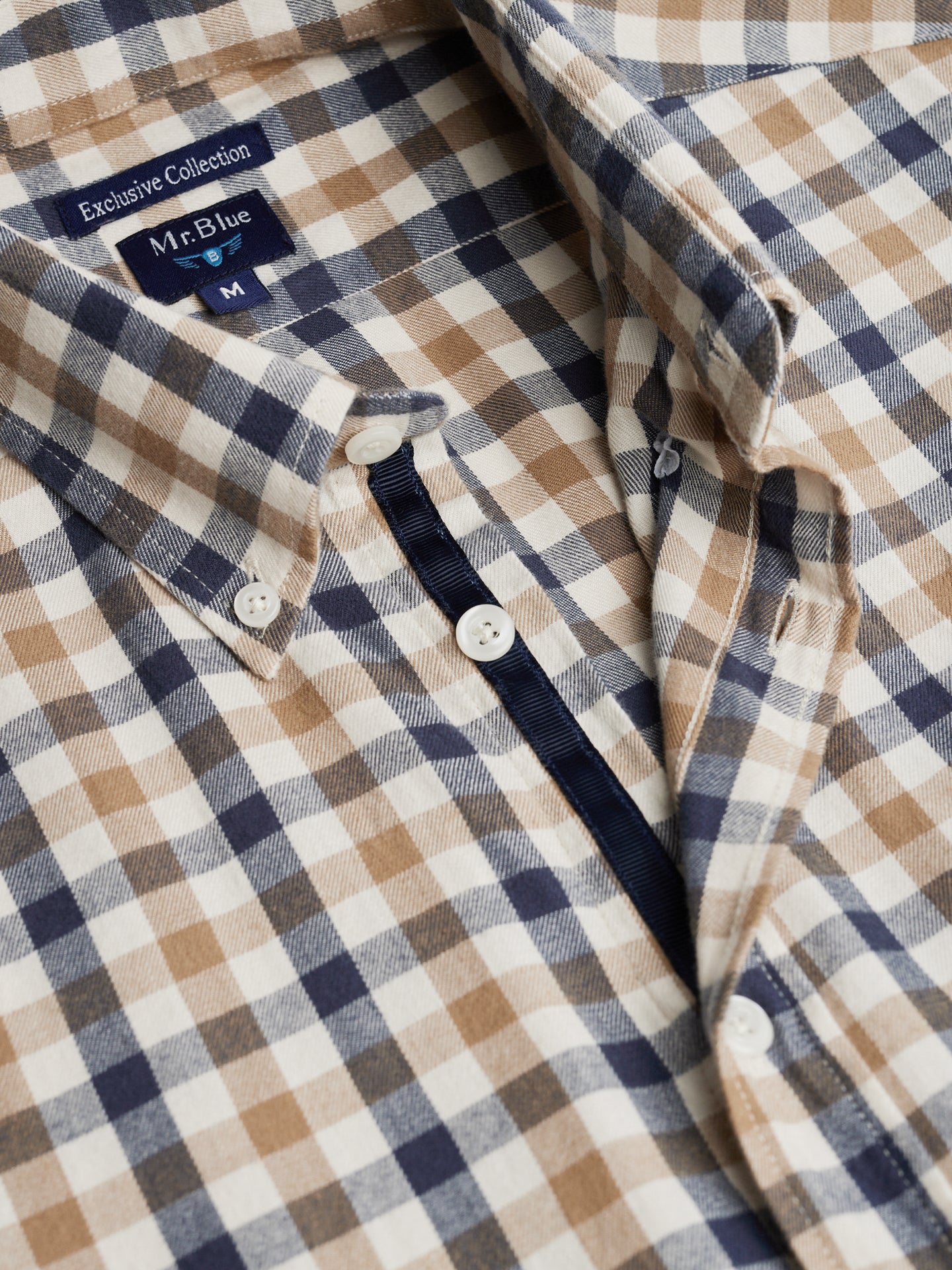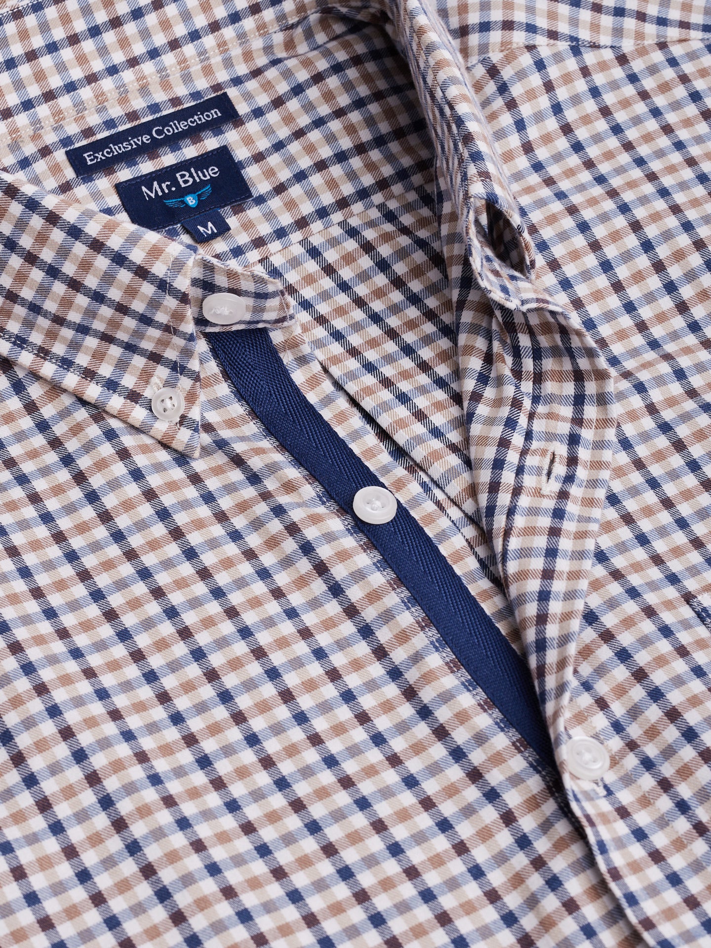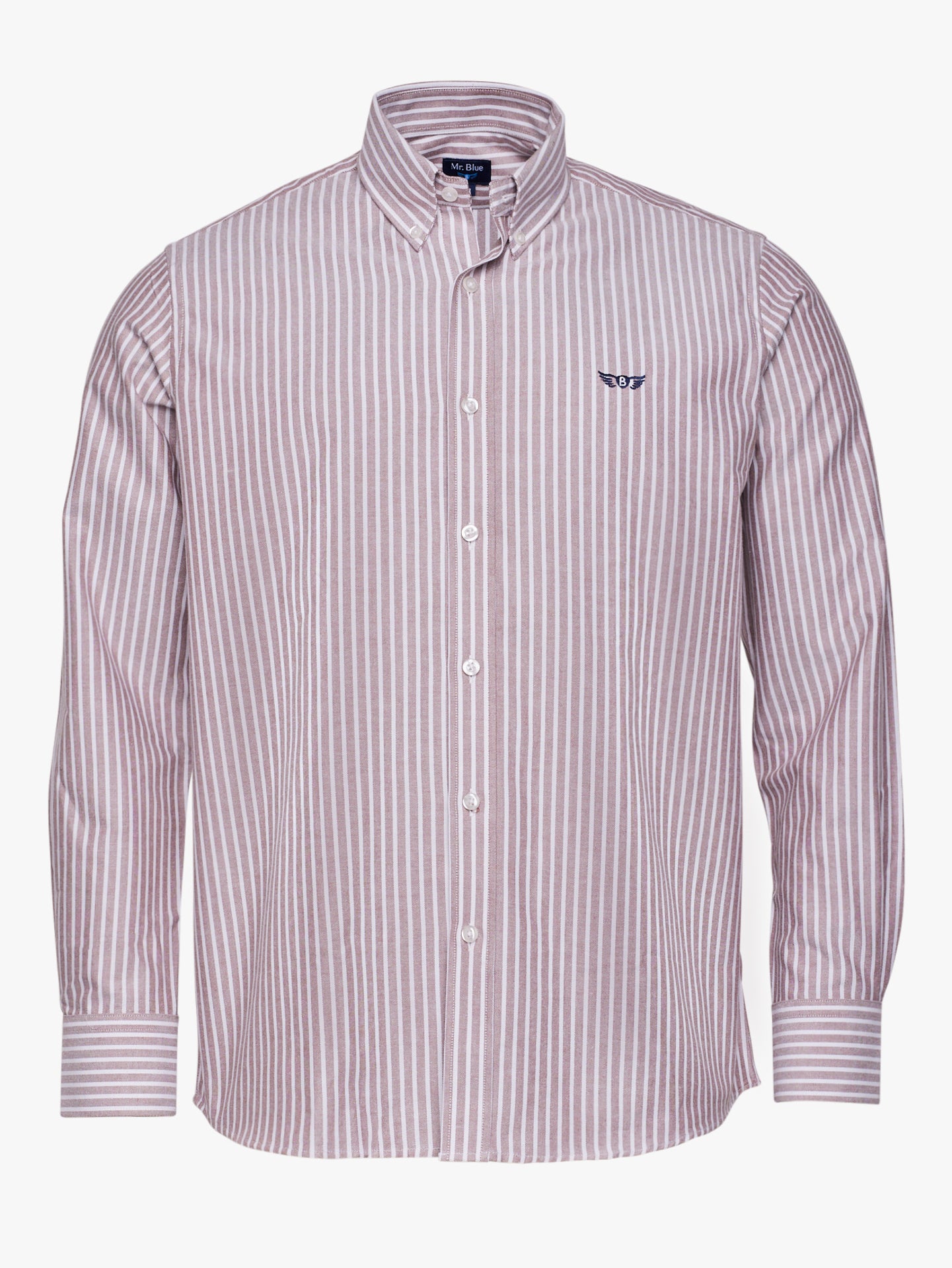 Camisa algodão às riscas azul claro e amarelo com bolso