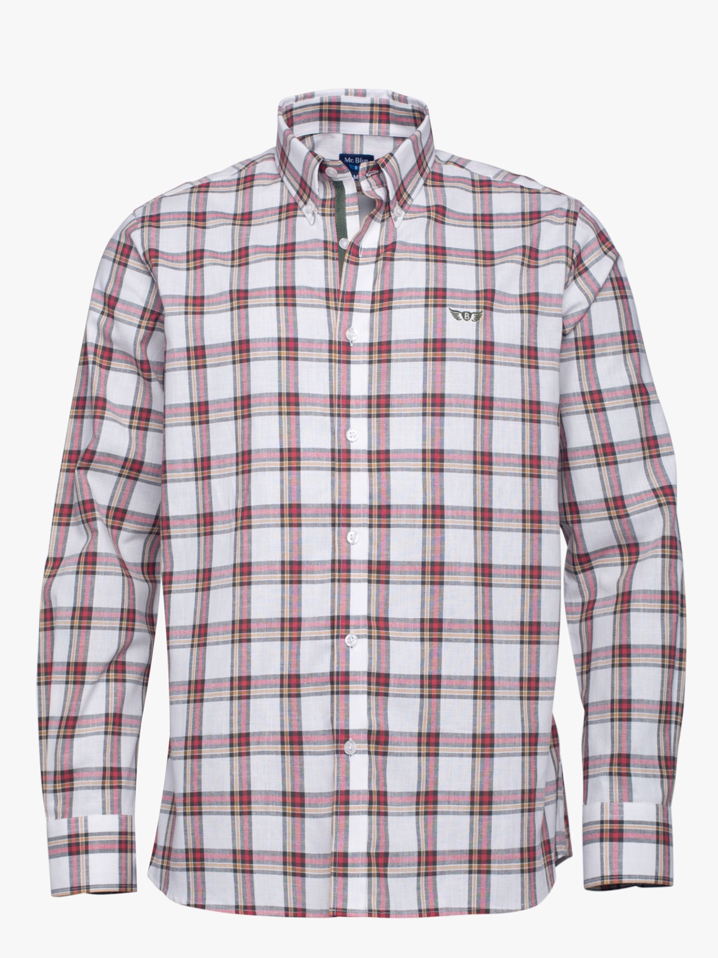Camisa de homem 100% algodão quadrados grandes branco e vermelho com logo bordado em verde escuro. Corte regular, fecho mediante abotoadura frontal, tape na carcela e manga comprida com acabamento em punho abotoado.