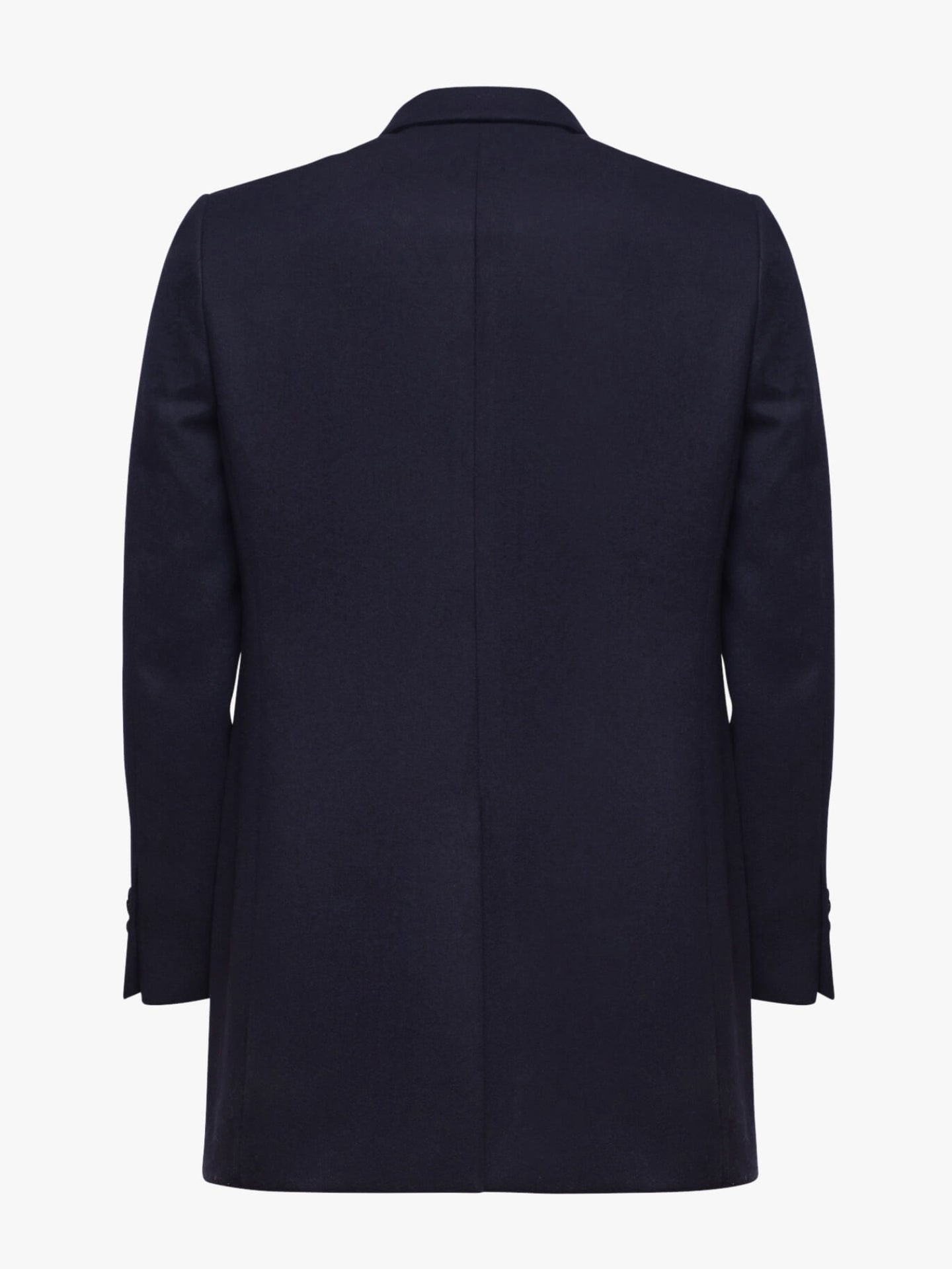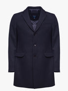 Sobretudo Homem Azul escuro. Corte direito, gola com lapelas e fecho de três botões. Dois bolsos com aba e um bolso à altura do peito. Manga comprida e abertura na parte posterior.