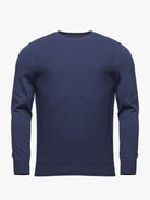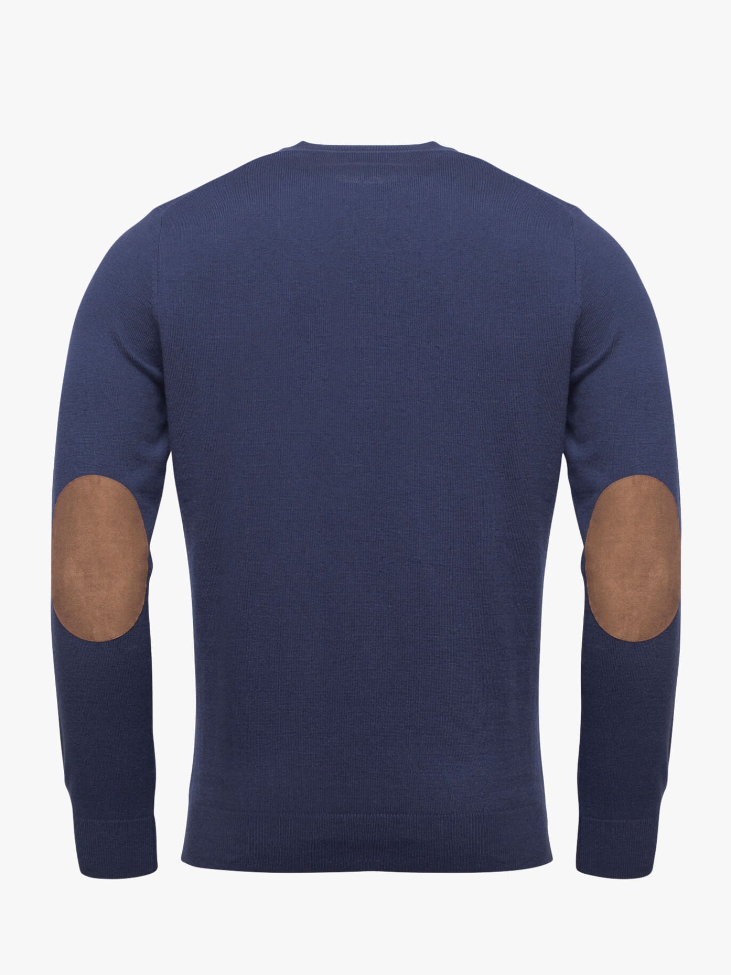 Camisola para homem gola redonda azul escuro com cotoveleiras em castanho. Confecionada em tecido de algodão e lã Merino. Corte casual, gola redonda, manga comprida e acabamentos canelados.