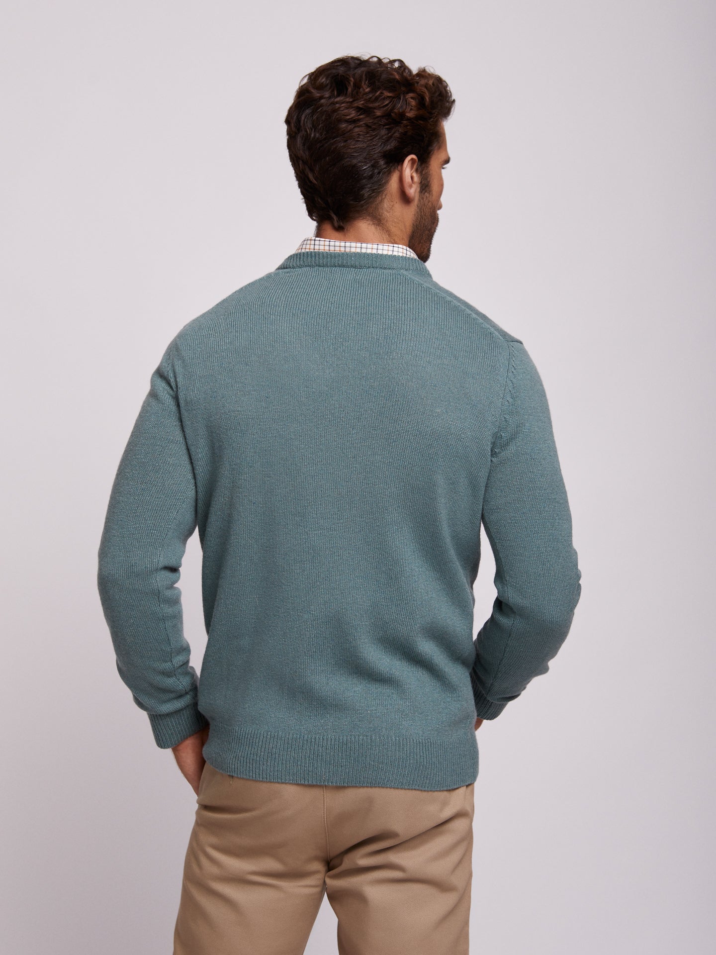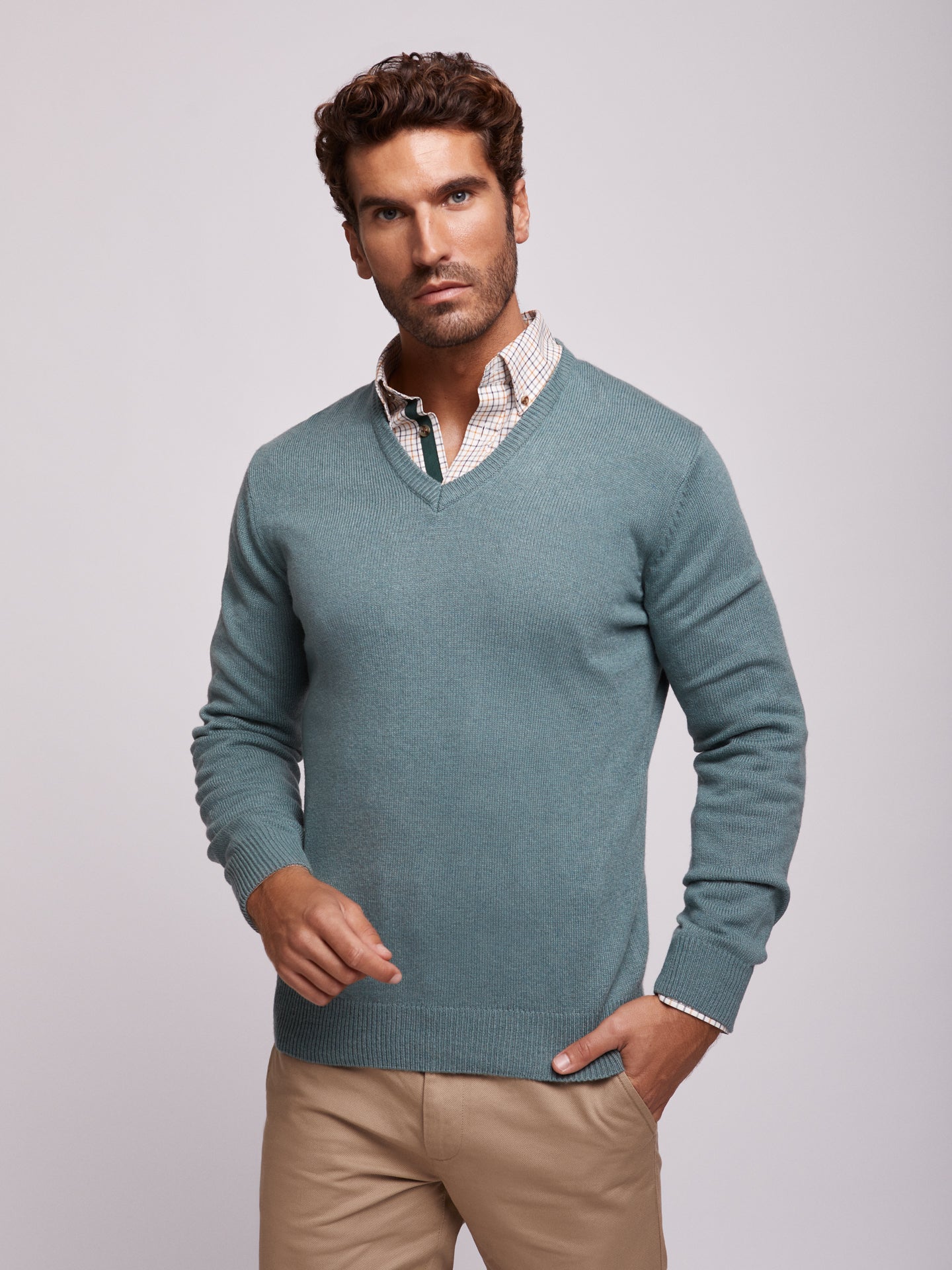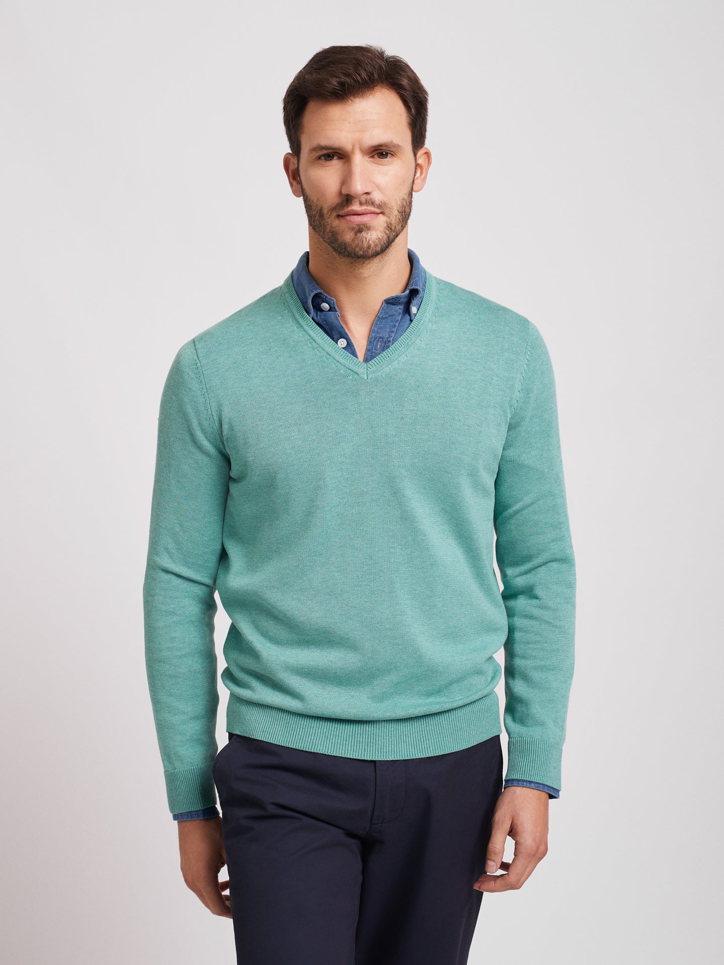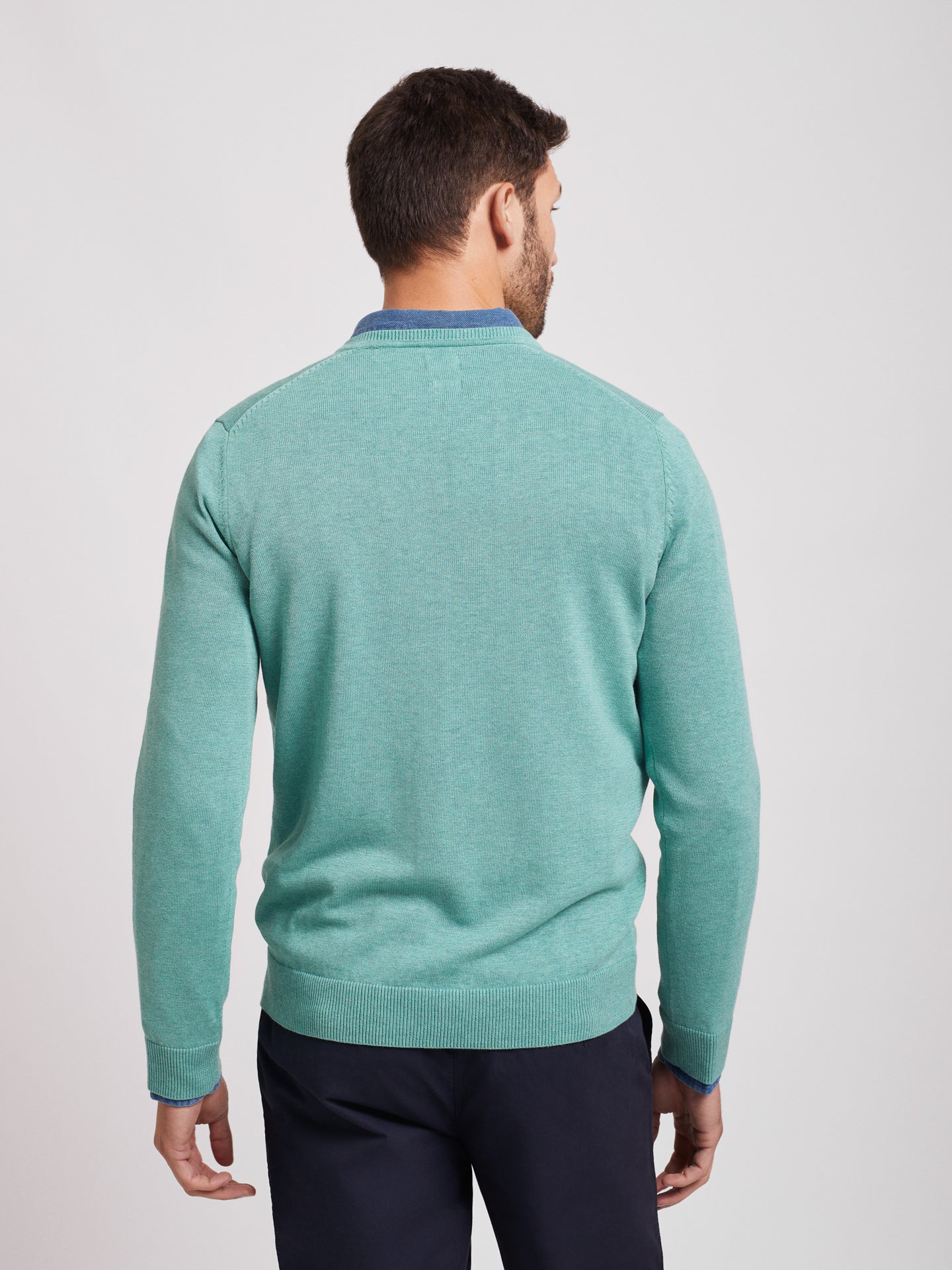 Camisola verde escuro em algodão decote em V com cotoveleiras