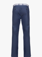 Calças Chinos Homem 100% Algodão Oxford azul denim com detalhe no cós às riscas branco e azul denim. Corte Tailored Fit. Muito confortáveis, são a escolha certa para os dias mais quentes.
