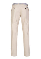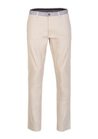 Calças Chinos Homem 100% Algodão Slim Fit beje com tape no cós às riscas azul e branco. Muito confortáveis, são a escolha certa para os dias mais quentes.