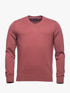 Camisola para homem laranja tijolo com cotoveleiras em castanho. Confecionada em tecido de algodão e caxemira. Corte reto, gola em bico, manga comprida e acabamentos canelados