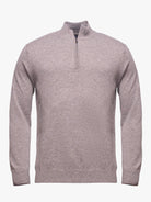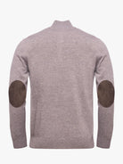 Camisola para homem gola com fecho de correr cinza beige com cotoveleiras em castanho escuro. Confecionada com caxemira. Corte casual, manga comprida e acabamentos canelados.