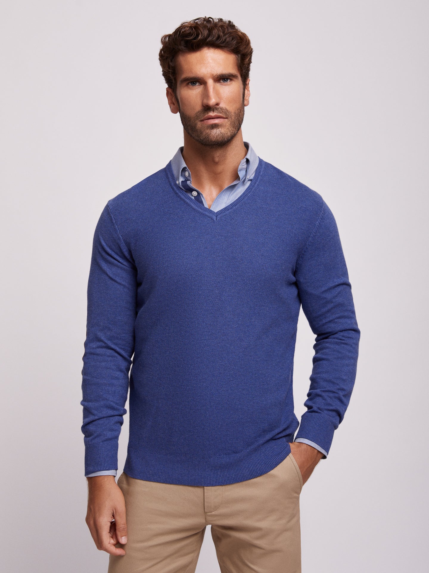 Camisola homem 100% algodão azul forte com decote em V e cotoveleiras. Peça Indispensável no seu guarda roupa. Ideal para um fim de semana ou um dia de trabalho descontraído. Ideal para usar com uma camisa.