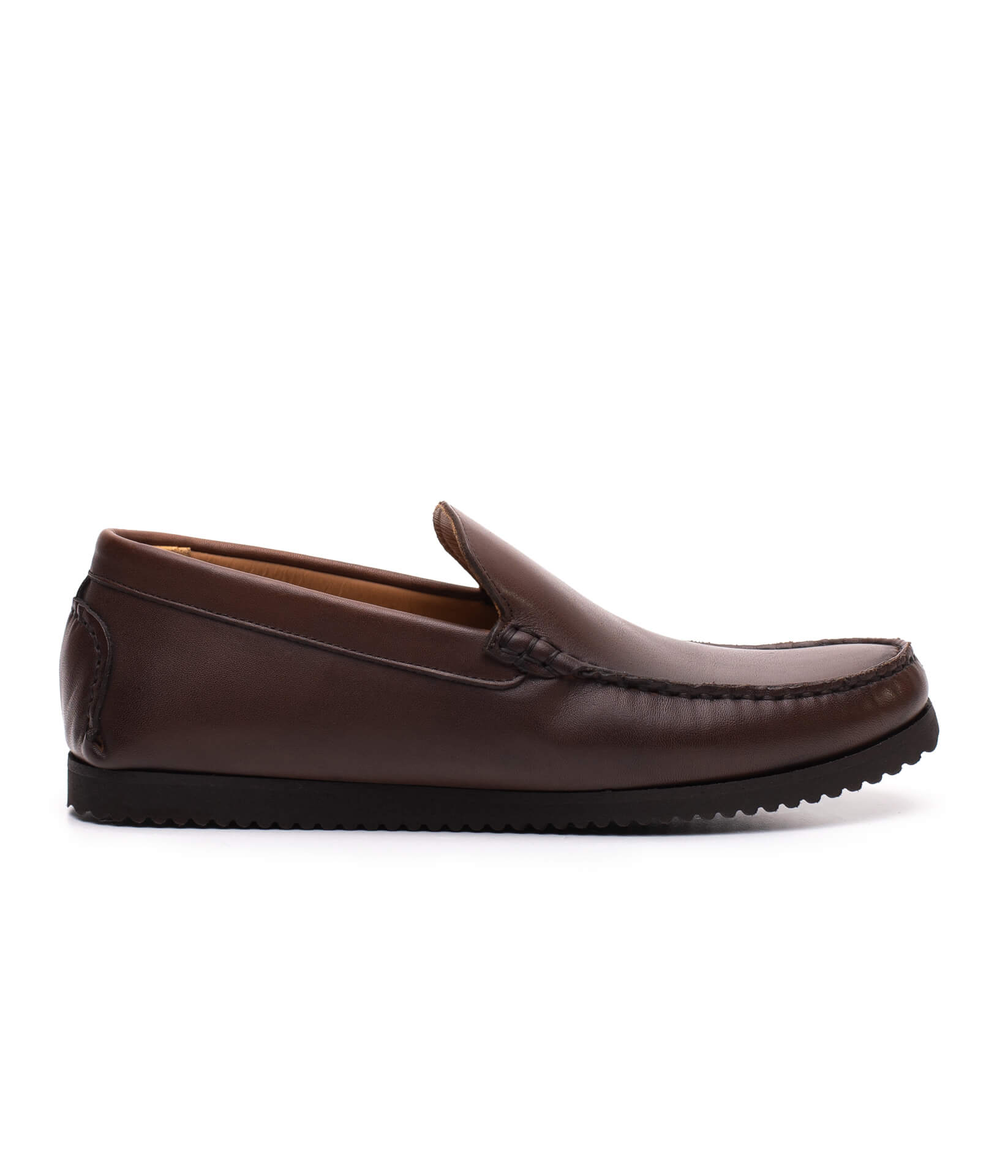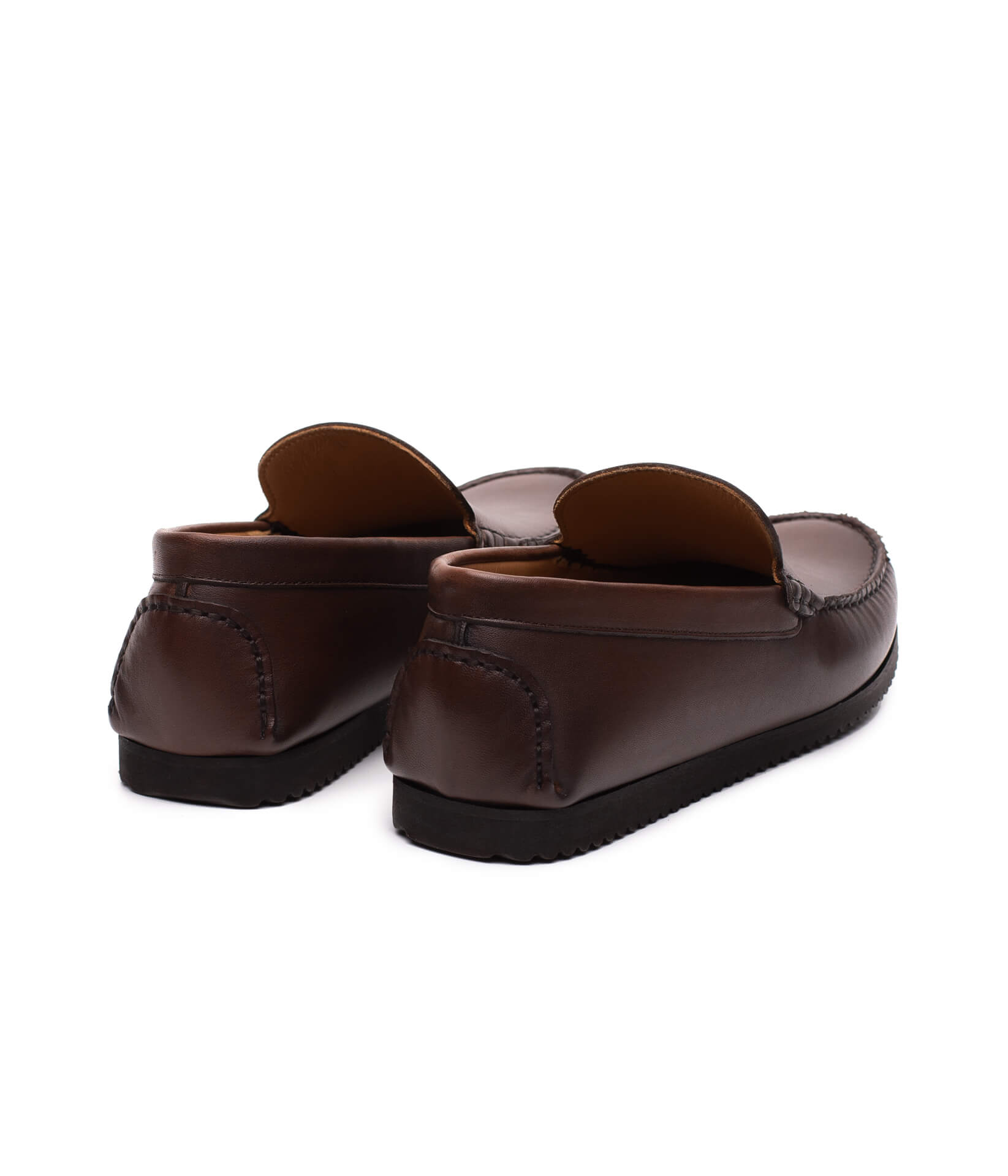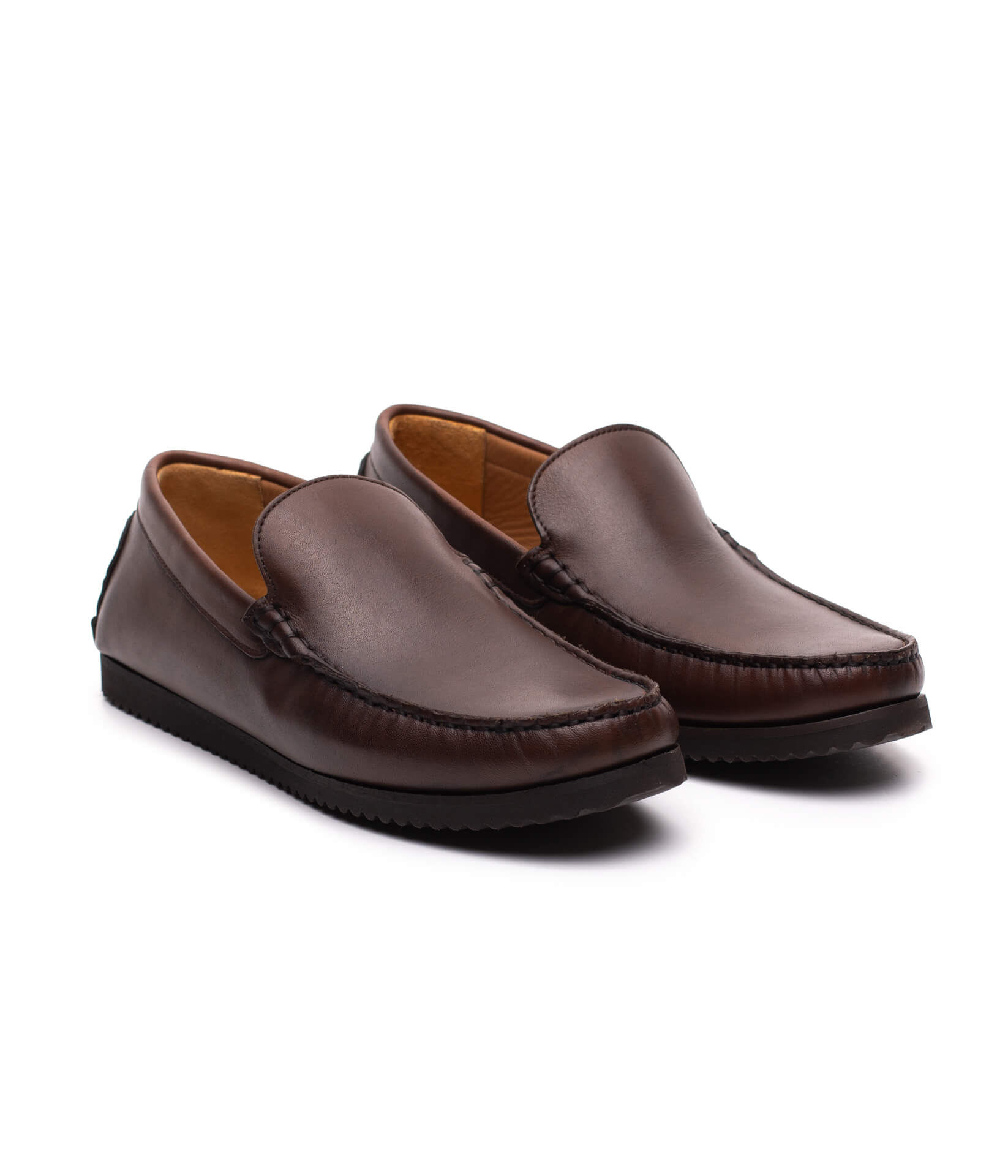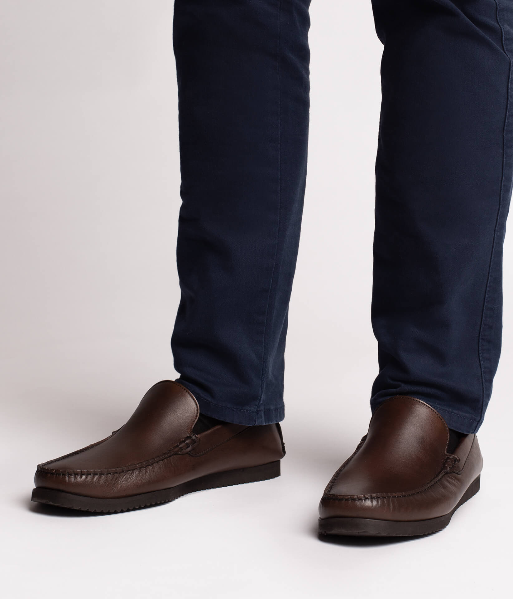 Um clássico desportivo para os apreciadores de sapatos sem atacadores. Este modelo venitian é feito a partir de couro castanho com sola de borracha e é o modelo que vai querer usar nos dias mais quentes.