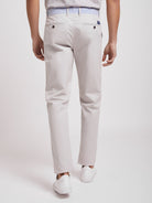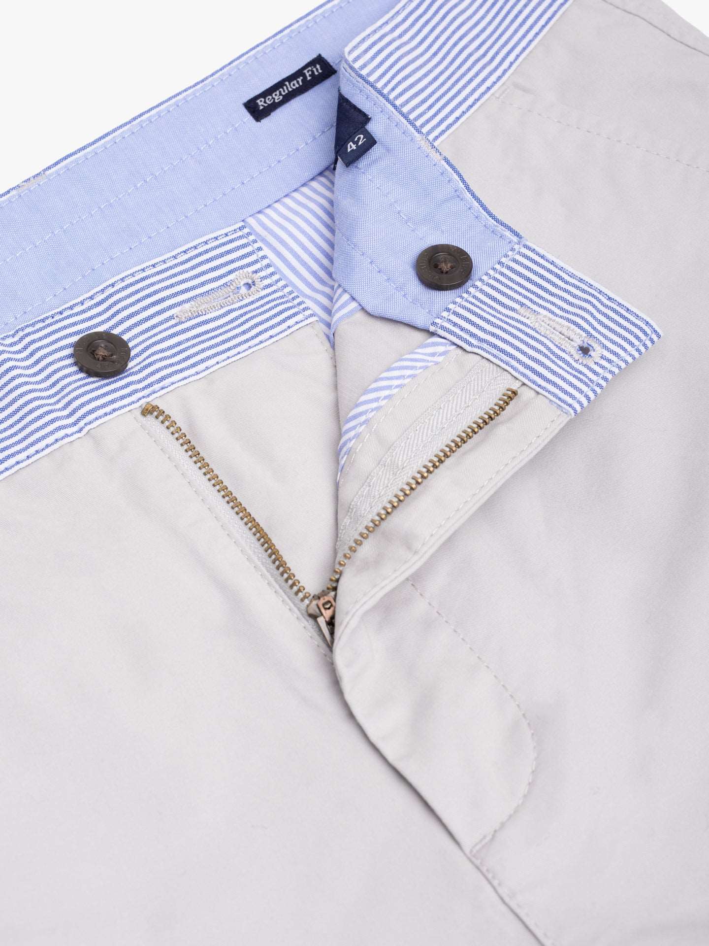Calças Chino bege claro homem 100% algodão. Cós às riscas azuis e brancas. Corte regular, fecho de botão e fecho de correr oculto por carcela, dois bolsos laterais e um bolso pequeno. Dois bolsos com casa de botão abotoados atrás e presilhas para cinto.